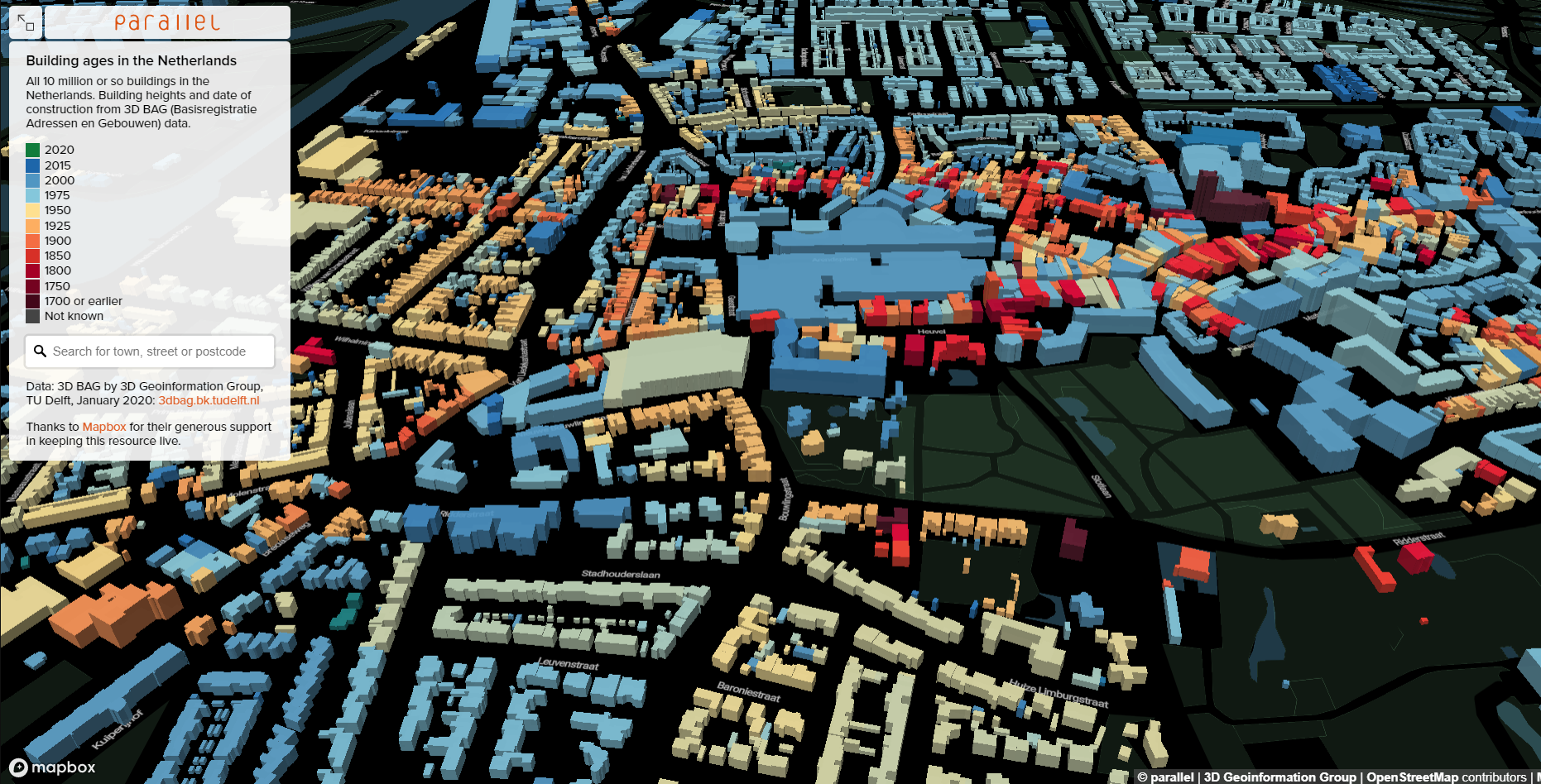 Hier een 3D afbeelding van de gebouwen in Oosterhout waarbij met kleurtjes is aangegeven hoe oud deze zijn.