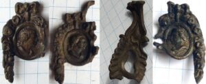 In de loop der tijd heb ik op een akker in Oosterhout diverse stukken messing kastbeslag gevonden. Te samen moeten deze op een bijzonder luxe kast hebben gezeten. Het begon met twee losse medaillon vormige stukken die versierd zijn met bloemetjes en een strik. Dit kastbeslag is verguld geweest en moet in die tijd dus super chique zijn geweest.