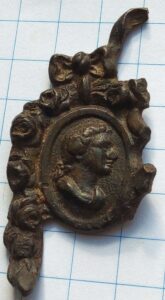 In de loop der tijd heb ik op een akker in Oosterhout diverse stukken messing kastbeslag gevonden. Te samen moeten deze op een bijzonder luxe kast hebben gezeten. Het begon met twee losse medaillon vormige stukken die versierd zijn met bloemetjes en een strik. Dit kastbeslag is verguld geweest en moet in die tijd dus super chique zijn geweest.
