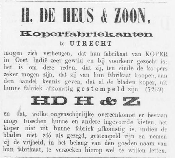 In 1834 wordt er een fabriek gebouwd in Utrecht (Vreeburg) die rond 1835 in gebruik is genomen (dat is dus iets later dan in onderstaand artikel staat vermeld). Vader H. de Heus stopt in 1835 waardoor zijn zoon Willem Hendricus de Heus de algemene leiding krijgt.