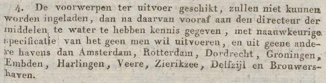 In de Koninklijke courant van 1809 staat vermeld dat er alleen vanuit specifieke havens goederen mogen worden geëxporteerd namelijk: Amsterdam, Rotterdam, Dordrecht, Middelburg, Groningen, Embden, Harlingen, Veere, Zierikzee, Delfzijl en Brouwershaven. De verwachting is dan ook dat er dit type loodjes ook van de andere havens moeten zijn geweest.
