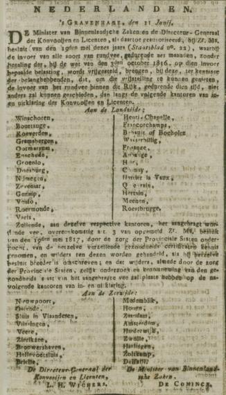 Hieronder een lijst uit 1816 met de kantoren van in- en uitklaring:
