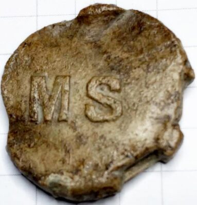 VZ: de tekst “MS”. Waar M.S. voor staat is vooralsnog onbekend. Het zou kunnen staan voor “Militaire School”. In 1886 werd er aan de prins Willem III kazerne in Amersfoort een rij- en hoefsmidschool toegevoegd (referentie). Het is bekend dat magazijnen van de diverse kazernes eigen zegelloodjes gebruikte, dus dit zou er ook een kunnen zijn. Natturlijk kan het in dat geval ook een loodje zijn van de Militaire School uit Haarlem (referentie)