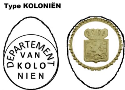 Op de voorzijde “departement van kolo nien” en op de keerzijde het kortere rijkswapen. In het voorbeeld is de laatste regel met “NIEN” weggevallen.