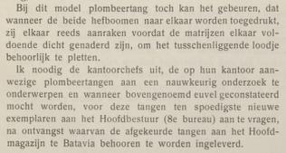 Een onderdeel van dit Hoofdbestuur was het 8e bureau die verantwoordelijk was voor de uitgifte van de plombeertangen in Batavia. Deze dienst was ook verantwoordelijk voor het vervoeren van de brieven of dit uitbesteden aan derden (postvervoer naar de Nederlandse Koloniën via boot en vanaf 1920 ook met het vliegtuig). Dit loodje is dus waarschijnlijk gebruikt als verzegeling van koloniale post.