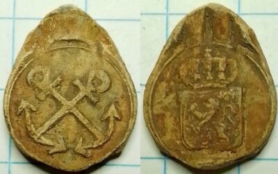 Dit lood is recent gevonden en heeft aan beide zijden de gekruiste ankers (negatief aangebracht) zoals tot aan 1795 werd gebruikt door de admiraliteit en later in 1815 door het ministerie van Marine. Omdat het geen rijkswapen heeft zal het waarschijnlijk door de admiraliteit voor 1795 zijn gebruikt. Ook tijdens de roerige Bataafse tijd (1795-1806) werd weleens terug gegrepen op oude symbolen dus ook dan zou het lood gebruikt kunnen zijn.