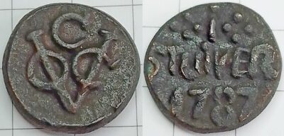 De Britse tegenhanger van de VOC was de East India Company (EIC). Deze gebruikte loodjes zoals hier in ht midden waarbij de V waarschijnlijk stond voor Vnited (United). Er zijn echter momenten in de geschiedenis geweest dat de VOC en EIC samenwerkte. Het is overigens niet geheel onmogelijk dat dit Engelstalige loodjes zijn van de VOC. Deze gebruikte immers wel de letter V terwijl de EIC dat niet deed.