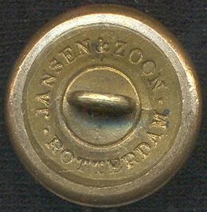 Knoop 23. Jansen en Zoon – Rotterdam (voortzetting van J.H.K. Jansen) was een knopenmaker in de periode ca 1835-1867. Het jaar 1867 was voor hen een rampjaar. Hierin overleed vader J.H.K. en de tweede broer. Hierna is er niets meer over deze knopenmaker te vinden. Tweedelig gestanste knopen komen vanaf 1850 veel voor. Het bedrijf heette echter pas Jansen en Zoon ergens na 1857. Datering knoop ca 1857-1867