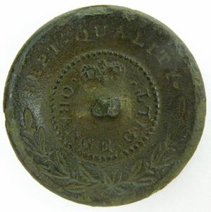 Knoop 20. Orange gilt : Gilt en plated knopen (uit UK) hebben een algemene datering van ca 1795-1850. Platte/(bolle) gegoten knopen werden echter tot ca 1830 gemaakt.