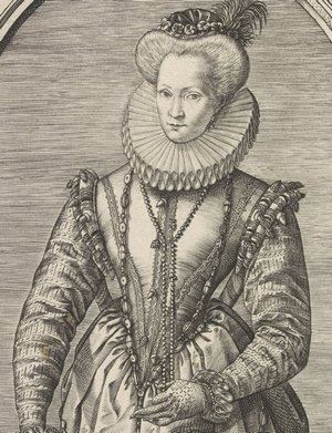 Op een andere afbeelding van het Rijksmuseum, een prent uit 1580-1590 zien we Francoise van Egmond, met ditmaal versieringen in de vorm van eikels en druiventrossen op de schouders, maar ook als sluiting.