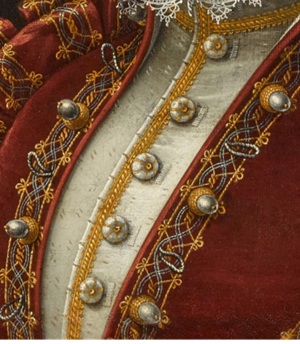 Op een schilderij uit de periode 1525-1549 zien we een vrouw met op haar schouders een klein formaat gouden versierde bolletjes. Dezelfde bolletjes worden op haar kleding ook gebruikt als sluiting. Duidelijk zichtbaar zijn de lusjes die om de knoopjes werden gedaan om de kleding te kunnen sluiten. Knopen en lusjes werden om en om geplaatst aan weerszijde van de randen van het te sluiten kledingstuk.