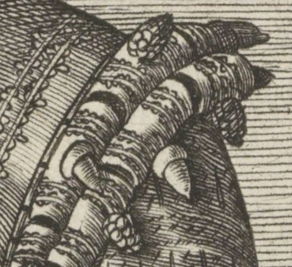 Op een andere afbeelding van het Rijksmuseum, een prent uit 1580-1590 zien we Francoise van Egmond, met ditmaal versieringen in de vorm van eikels en druiventrossen op de schouders, maar ook als sluiting.