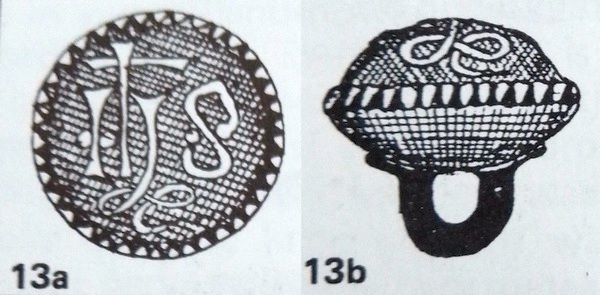 Hierbij gaat het allemaal om tinnen knopen, die er dus zilverkeurig uit hebben gezien. Knopen 8 t/m 10 zijn gemaakt van massief tin. De anderen zijn allemaal hol.