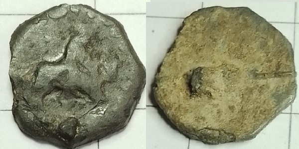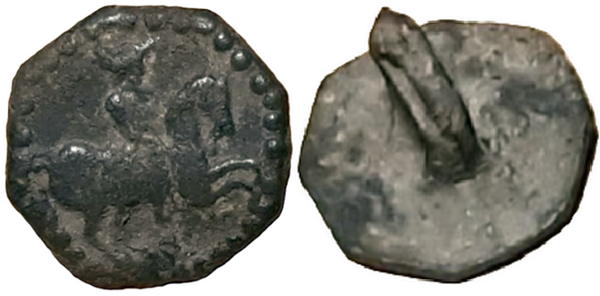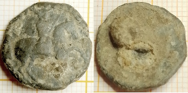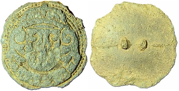 Onlangs werd ik gevraagd om een knoop te determineren die door Daniel van Buuren gevonden is. Het gaat hierbij om een lood-tinnen knoop met een afbeelding van een wapenschild erop. De knoop is gegoten en heeft een (afgebroken) lusoog. Op basis van andere knopen met een dergelijk oog krijgt de knoop voorlopig een datering mee van 1650-1725.