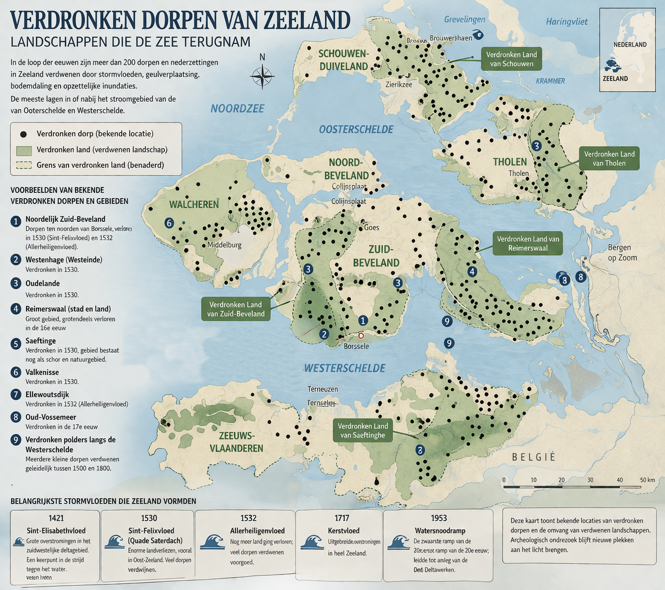 Een belangrijke rol in deze verdwijningen speelden een aantal grote stormvloeden die Zeeland ingrijpend hebben veranderd. Zo leidde de Sint-Felixvloed – ook wel de “Quade Saterdach” genoemd – tot enorme landverliezen, vooral in Oost-Zeeland. Slechts twee jaar later volgde de Allerheiligenvloed van 1532, die de schade verder vergrootte en het definitieve einde betekende van veel nederzettingen. Ook de Sint-Elisabethsvloed van 1421 had al eerder grote delen van het zuidwestelijke deltagebied onder water gezet en vormde een kantelpunt in de strijd tegen het water.