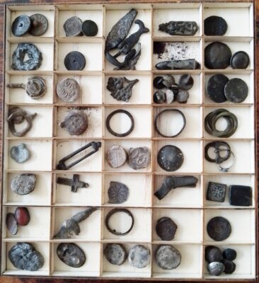 Een mooie bijkomstigheid van het metaaldetecteren, is voor mij determinatie en het bijbehorende onderzoek. Ik berg alle vondsten op per locatie in bakken en gripzakjes. Wanneer ik meerdere vondsten van één locatie de moeite vindt om te laten zien, dan doe ik deze ook wel eens in een letterbak. Munten die het waard zijn, gaan in hartbergers. Dit bij elkaar houden van vondsten heeft als voordeel dat je per locatie inzicht kunt verkrijgen in de geschiedenis die daar heeft afgespeeld. Zie als voorbeeld het artikel Oorlog met de Fransen. Onbekende vondsten kun je op die manier makkelijker determineren en/of dateren (zie hieronder bij context en complex datering).