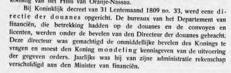 The Departments of General Administration during the period 1798-1907In 1819, the In and Outgoing Duty and Excise service (“in en uitgaande regten”) replaced the Convoys & Licenses service. In 1877, this service changes its name to “Division of direct taxes, import duties and excise duties” because then the last export duty is abolished. In the register of actors of the national archive you can find all (former) services and ministries from 1795 quite easily. Two examples of this are Convooien en Licenten and In en uitgaande rechten.
