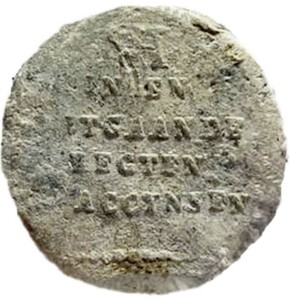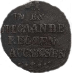 This lead is very similar to its predecessor type SRIJKS-REGTEN. On the reverse, however, is the text “IN EN UITAANDE REGTEN EN ACCYNSEN” with a more extensive decorative bar.