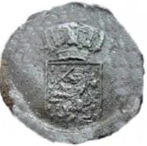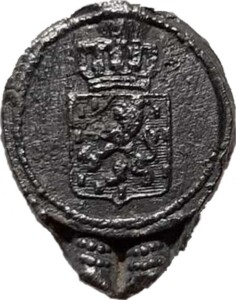 From 1815 the national coat of arms is put on customs seals. This is a shortened version of the full national coat of arms. The two lions that normally hold the coat of arms, containing the Dutch lion, are missing. What remains is a crowned shield with the Dutch lion clawing to the left on a background shaded with horizontal lines with small rectangular blocks on it. Stamps of this shortened coat of arms are sealed in a lead seal. It is striking that over time the coat of arms is slightly different on the different types of customs seals. Sometimes the coat of arms is longer, shorter, thicker, coarser or more detailed. The coat of arms can therefore sometimes be used to identify a customs lead.