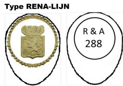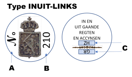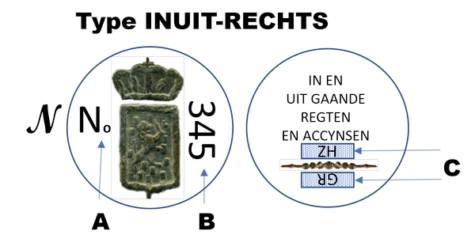 This type is very similar to the INUIT-LINKS type and also has a customs registration number. At position A to the left of the Dutch coat of arms, the word “No” is now simply horizontal (from ca 314 it changes from an elegant letter to a straight letter). Position B shows the registration number clockwise from 230 to 345. The orientation of the registration number on this type of lead is therefore turned RIGHT (RECHTS), hence this type designation.