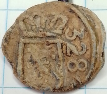 On one side we see a shorter coat of arms than before without a cross on the crown. The coat of arms is inside a pearl wreath.