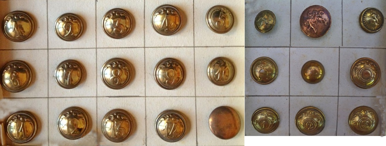 Belgische infanterie regimentsknopen 1 t/m 14 met hierop een nummer in de periode ca 1875-1915. Knopen met geribbelde cijfers zijn waarschijnlijk voor officieren geweest maar er zijn vesten van onderofficieren bekend waar de knopen ook geribbeld zijn. Vanaf 1915 worden dit meestal leeuwenknopen. Meer info Uniformknopen Belgische Infanterie
