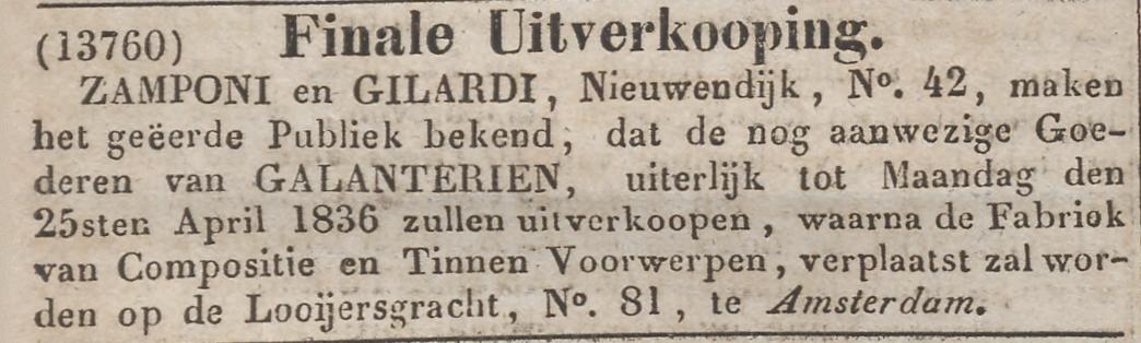 Dan in 1836 is er een finale uitverkoop en verhuizing. Hierna komen we het bedrijf niet meer tegen.