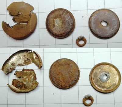 Hier een extra fein knoop van de schutterij die uit elkaar viel. Wat opvalt is dat er aan de binnenkant nog wel een flinterdun laagje zilver zit. De basis en kop werden dus verzilverd voordat ze samen werden gevoegd. Een ander opvallend item is het vulsel. Dit is namelijk of een stukje leer of (heel hard) karton.