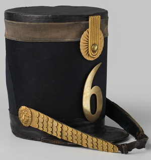 Badge/appliqué (embleem van een uniform) met het cijfer 6. Op de keerzijde twee afgebroken bevestigingspunten waar ongetwijfeld een naald heeft gezeten.