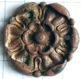 Cache Clou, hoekbevestiging (of meubelversiering) van een schilderij in de vorm van een rozet. Deze heeft drie gaatjes voor bevestiging. Deze heeft nog sporen van vergulding. Datering 19de eeuw.