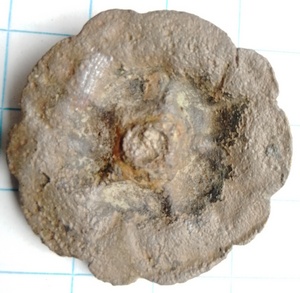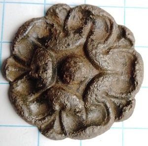 Cache Clou, hoekbevestiging (of meubelversiering) van een schilderij in de vorm van een rozet. Deze heeft een bevestigingspunt in het midden. Datering 18de/19de eeuw.