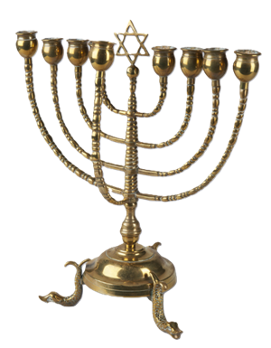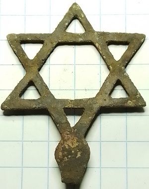 Davidster die bovenop een koperen Chanukia heeft gezeten. Dit is een negenarmige kandelaar die wordt gebruikt bij het joodse feest Chanoeka. De kandelaar heeft acht kaarshouders, één voor elke dag van het Chanoekafeest. De negende kaars wordt de sjamasj of dienaar genoemd en wordt gebruikt om de andere kaarsen mee aan te steken.
