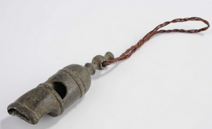Achterkant van een tirailleursfluit van tin met een koordje. De fluit is cilindervormig en heeft drie opstaande randen. Aan de voorkant zit een half maanvormig blaasgat. En in het midden zitten twee halve maanvormige gaten. Het koordje zit aan een bolvormig uiteinde.