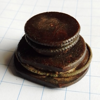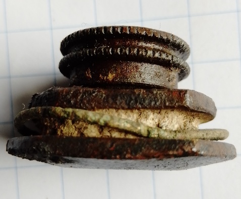 Flessluiting. Schroefdop plus de twee delen waartussen de (waarschijnlijk) leren zak geklemd heeft gezeten. Ook de koperen klemring is nog aanwezig.