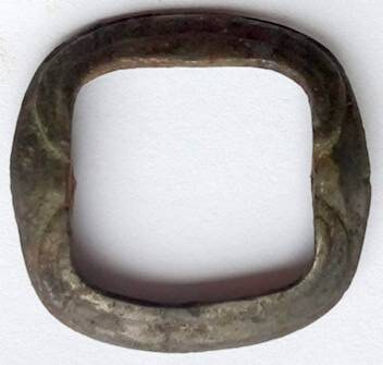 Tweedelige schoengesp met ontbrekende middenstijl gemaakt van een tin-legering. In de collectie van Batavialand zit een vergelijkbare schoengesp die is gevonden in een scheepswrak. Datering ca 1775-1825