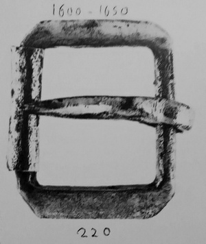 Eenvoudige rechthoekige gesp met angel en losse roller als gesp-rust. Datering 1600-1945