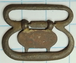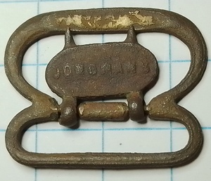 Gesp voor waarschijnlijk bretels met opschrift “Jongmans”. Het patent van dergelijke gespen is in 1880 geregistreerd.