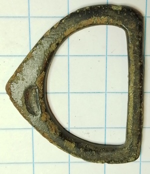 D-vormige enkelvoudige lipvormige gesp waarbij de lip ingekerfd is. Datering (voornamelijk) ca 1350-1450. Nummer 71 in het boek Buckles 1250-1800 paperback