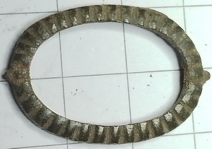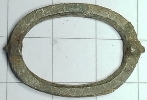 Ovaal gesp gelijkend voorwerp met aan de zijkanten pinnen. Het lijkt dus ergens in bevestigd te hebben gezeten.