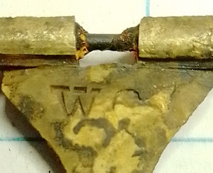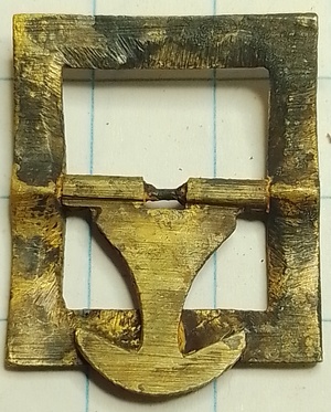 Vergulde gesp met visstaart-bevestiging. Op de bevestiging staan de letters WG