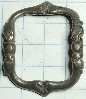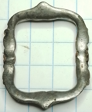 Tinnen versierde gesp. Aan de korte zijde lijkt een bladmotief gegrafeerd te zijn. Aan de lange zijde in het midden drie bolletjes