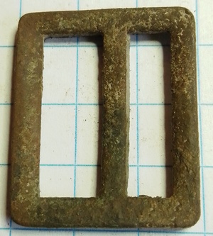 Verstelgesp met twee openingen. De ene opening is groter dan de ander. De gesp is vrij plat dus zou ook voor een webbing koppel gebruikt kunnen zijn.