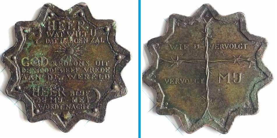 KZ: Een afbeelding met een kruis van prikkeldraad en de tekst: “Wie U vervolgt, vervolgt MIJ” en de datum 1958, in de elf punten staan letters die samen het woord GODSPENNING vormen.
