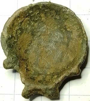 Muurhaak of beslag in vorm van waaier en twee hoorns. Platte metalen jacobsschelp met aan weerszijden een puntje. Haaks hierin een deel staaf (afgebroken). Mogelijk verstevigd beslag voor hout.