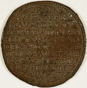 Jeton of rekenpenning met hierop het wapenschild van Frankrijk (3 lelies), die van de Republiek (generaliteitsleeuw) en Engeland. Het gaat hierbij om een samenwerkingsverband tussen de Republiek, Frankrijk en Engeland in 1596. Het was een “triple alliantie” tegen de Spanjaarden. Deze rekenpenning is ter ere van deze samenwerking in 1597 te Dordrecht geslagen.