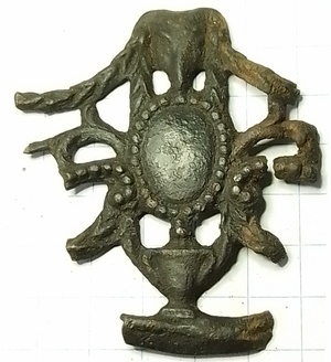 Stijlelementen: bovenaan een ramskop, onderaan een vaas en een ovaal afgezet met parels.