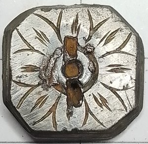Keelknoopje of manchetknoop, vierkant (of achthoekig) van zilver of tin met hierin een bloemmotief gegrafeerd. Bevestiging is van ijzer geweest.