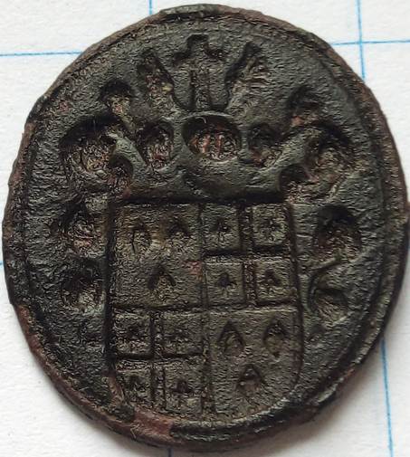 Wapenschild met hierboven een kruis tussen vleugels. Het wapen heeft 4 kwartieren. Het eerste en derde kwartier zijn verdeeld in 4 kwartieren met in ieder kwartier een kruis. In het tweede en vierde kwartier staan drie ruitjes.