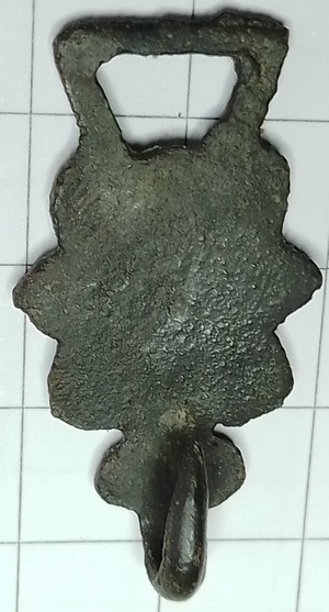 Enkelvoudig kledinghaakje. Een kruis met een punt in het hart omgeven door ranken.