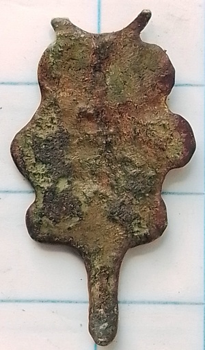 Kledinghaak met rechthoek en ribbels. Afgesleten.